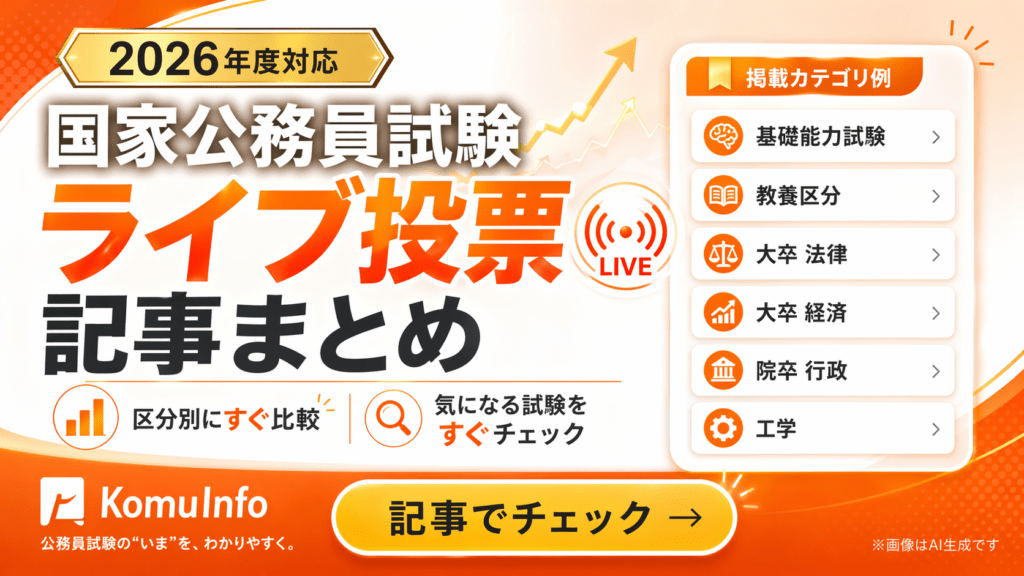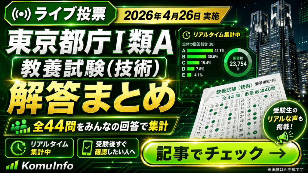 【ライブ投票】東京都庁Ⅰ類A 教養試験(技術)の解答まとめ【2026年4月26日(日)】【ライブ投票】東京消防庁消防官1類 教養試験の解答まとめ【2026年4月26日(日)】【ライブ投票】東京都庁Ⅰ類A 教養試験の解答まとめ【2026年4月26日(日)】【ライブ投票】特別区Ⅰ類 (事務ICT) 専門試験の解答まとめ【2026年4月19日(日)】【ライブ投票】特別区Ⅰ類(一般事務) 専門試験の解答まとめ【2026年4月19日(日)】【ライブ投票】東京都庁Ⅰ類B(一般方式) 教養試験(技術)の解答まとめ【2026年4月19日(日)】【ライブ投票】東京都庁Ⅰ類B(一般方式) 教養試験(技術以外)の解答まとめ【2026年4月19日(日)】防衛省の休職者数は何人?合計と内訳・推移を解説【2025年】