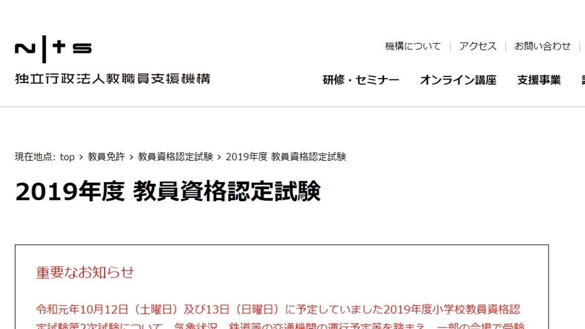 独立行政法人教職員支援機構(所管:文部科学省)は2019年10月11日、台風19号の影響で小学校教員資格認定試験の二次試験が実施できないため、受験予定者全員を合格にすると発表しました。