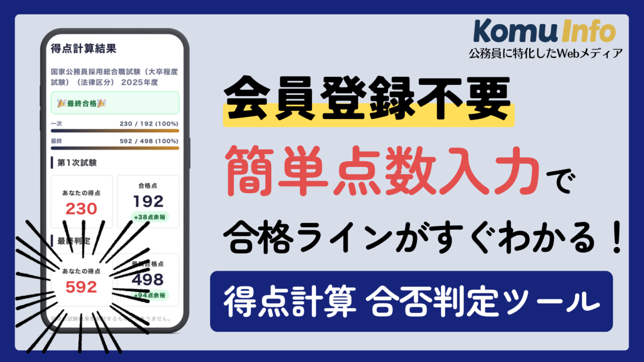 得点計算・合否判定ツール 【2026最新】国家総合職(大卒)の得点計算・合否判定ツール 得点計算・合否判定ツール#国家総合職#得点計算・合否判定ツール 2026年2月21日 komuinfo https://www.komuinfo.com/wp-content/uploads/2025/04/KomuInfoロゴ-2.png 公務員の給料ならKomuInfo